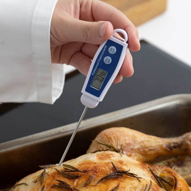 The waterproof thermometer incorporates a Ø2.5 x 122 mm stainless steel penetration probe and incorporates the latest microprocessor technology. It is designed for reliability and ease of use in routine catering, food preparation and industrial applications.